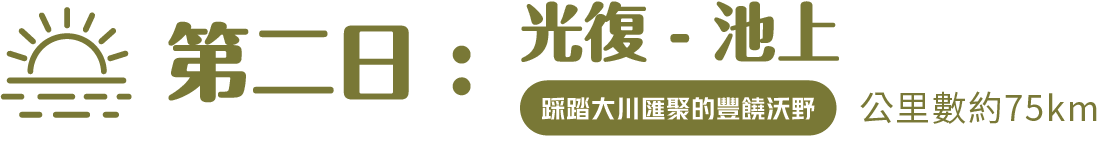 早上於酒店享用早餐後,沿森林中的小徑來到【大榮大富平地森林園區】觀賞美麗的花海美景,隨後將循單車騎乘193線道,沿途將騎乘於滿穗金黃的稻田、阿勃勒艷夏黃金雨、小葉欖仁林蔭大道,觸目所及皆是美景。隨後將造訪【玉富自行車道】,見證【歐亞板塊】擠壓的奇蹟。午餐將品嚐玉里有名的【玉里麵】。餐後將沿花東密境【卓富公路】南行,踩踏於中央山脈東麓的鄉間小路,不用與汽車爭道,獨享金黃稻浪、花海與山勢美景,沿途地勢平緩,秀姑巒溪水系在丘陵間蜿蜒流過,形成了各種不同的聚落與自然景致,斷續相銜的田野間,交錯著層層疊疊的梯田,阡陌相連的平坦水田,春夏季節有滿眼的翠綠,秋冬則呈現遍地的金黃油菜花與雪白野芒。結束約65公里的騎乘之後,將抵達池上著名景點【金城武樹】、【伯朗大道】、【天堂之路】等,晚上將住宿於池上的酒店並享用當地風味料理。